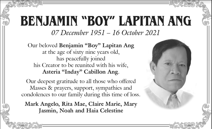 Benjamin “Boy” Lapitan Ang October 28, 2021 Author: INQ Memories INQ Memories October 28, 2021 Previous Article Ricardo S. Po, Sr. Next Article Judge Juan V. Landingin
