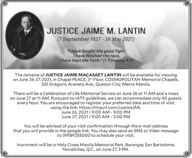 Justice Jaime Macasaet Lantin June 21, 2021 Author: INQ Memories INQ Memories June 21, 2021 Previous Article Ramon “Chito” Ambalada Next Article Joseph Christian Ariel “Nonoy” Uy Mendoza