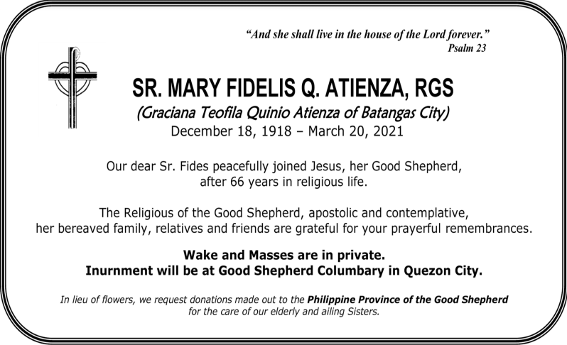Sr. Mary Fidelis Q. Atienza, RGS March 22, 2021 Author: INQ Memories INQ Memories March 22, 2021 Previous Article Engr. Faustino “Jun” C. Fernandez, Jr. Next Article Dr. Antonio Nable Acosta